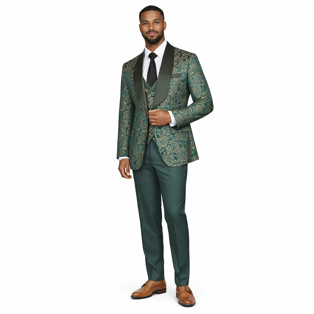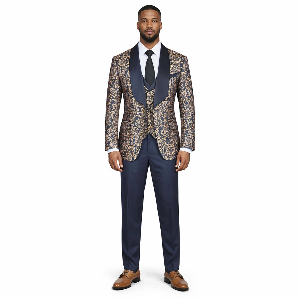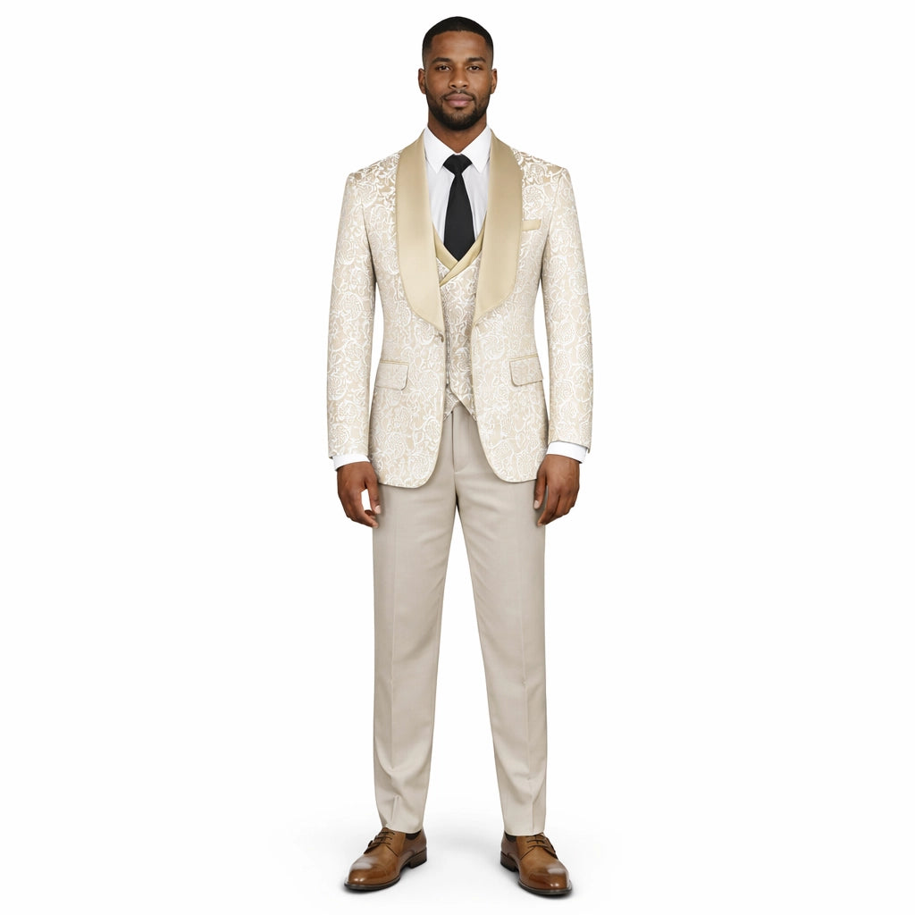 3-Piece Suit Men's Vintage Gold Damask Jacquard Suit for Prom Party Wedding