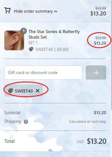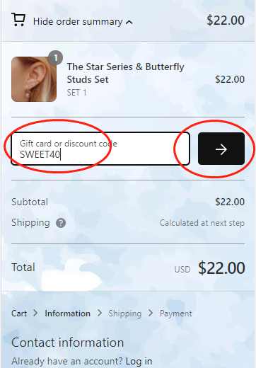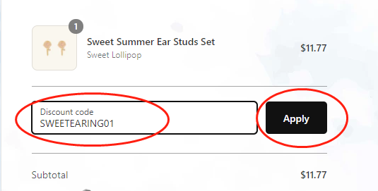 Type in "SWEETEARING01" and click Apply. Then you have applied the discount successfully!